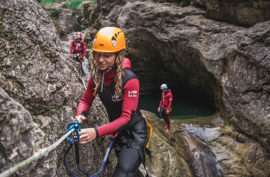 Sitzt der Helm? Haben Sie die Karabiner und Seile um? Gut so, denn richtig ausgerüstet geht es den natürlichen Lauf der Strubklamm entlang. Von Felsvorsprüngen hinab und hinein in eiskalte Tümpel und Bäche. Nichts für schwache Nerven. Einfach wunderbar aufregend! – Erst recht der spektakuläre Sprung aus elf Metern Höhe ...
